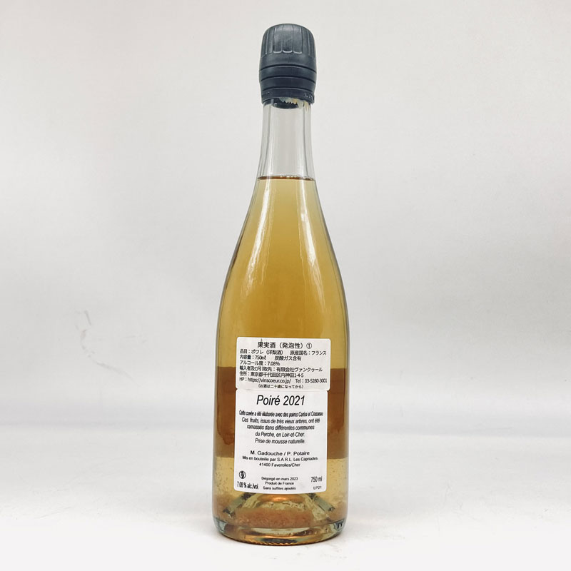 収穫日はカレジが9月15日~25日、クラソ ルージュが10月26日、27日。残糖は7.3g/L の辛口!使用する洋ナシは全て樹齢150年 を超えるロワール・エ・シェール県の北部にし か存在しない大変貴重な土着品種!かつて ロワール・エ・シェール県に存在した昔ながら のポワレをカプリアードのメトード・アンセスト ラル製法で蘇らせた!ガス圧は8.9気圧! SO2無添加!ノンフィルター! ※泡に勢いがあるため、良く冷やし て、斜め45度に瓶を傾けてご開栓く ださいませ